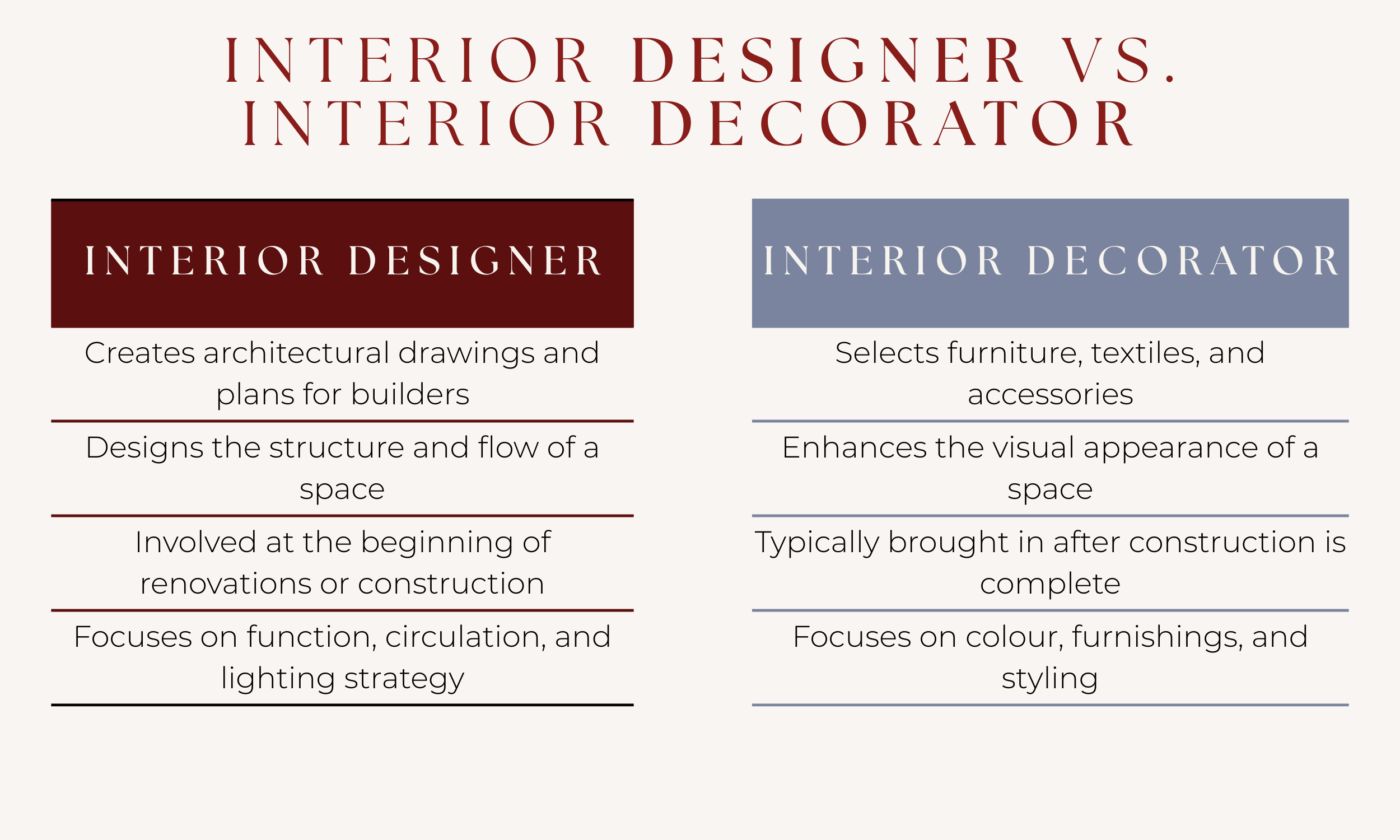 In other words, decorating makes a space look beautiful. Interior design makes a space work beautifully.